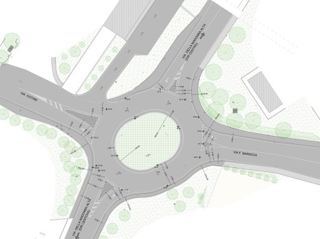 Per impedire l’attraversamento della rotatoria ad una velocità non adeguata è stata opportunamente verificata la deviazione dei veicoli attraverso il disegno dell’isola centrale e delle immissioni di ciascun ramo. Da qui la forma “squadrata”. Inoltre, per consentire l’accessibilità agli esercizi commerciali di via Madonna Alta, si prevede di modificare la viabilità interna del parcheggio antistante gli stessi, creando un unico senso di marcia con ingresso da Via Cotani e uscita su via Madonna Alta.