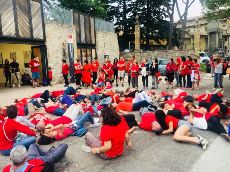 Spoletini e turisti si sono ritrovati al Giro della Rocca con un flash mob di pochi minuti che ha voluto sottolineare il valore e il ruolo dei legami umani: oltre alle magliette rosse, un filo rosso tenuto da tutti i presenti ha creato un reticolato che ha coinvolto via via i passanti di una delle vie più frequentate nel secondo sabato di Festival. Poi l’intrico della relazioni umane si rompe all’improvviso e tutti a terra, mentre una voce ha scandito le parole di un padre, di una madre: