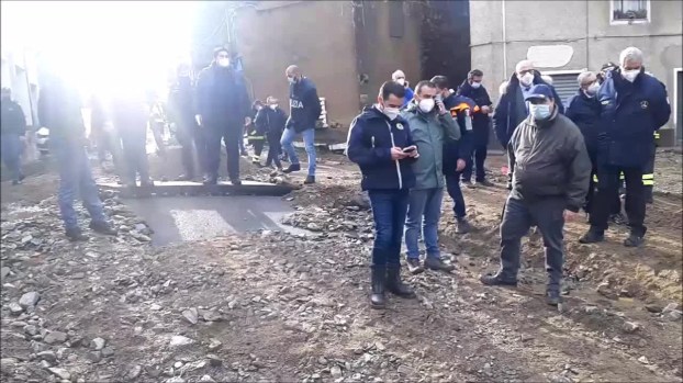 Il presidente della Regione Sardegna, Christian Solinas, insieme al presidente del Consiglio regionale, Michele Pais, ed il capo della Protezione Civile, Francesco Borrelli, impegnati in sopralluoghi nelle zone investite dal maltempo nel nuorese, dove sono morte tre persone. vbo/com