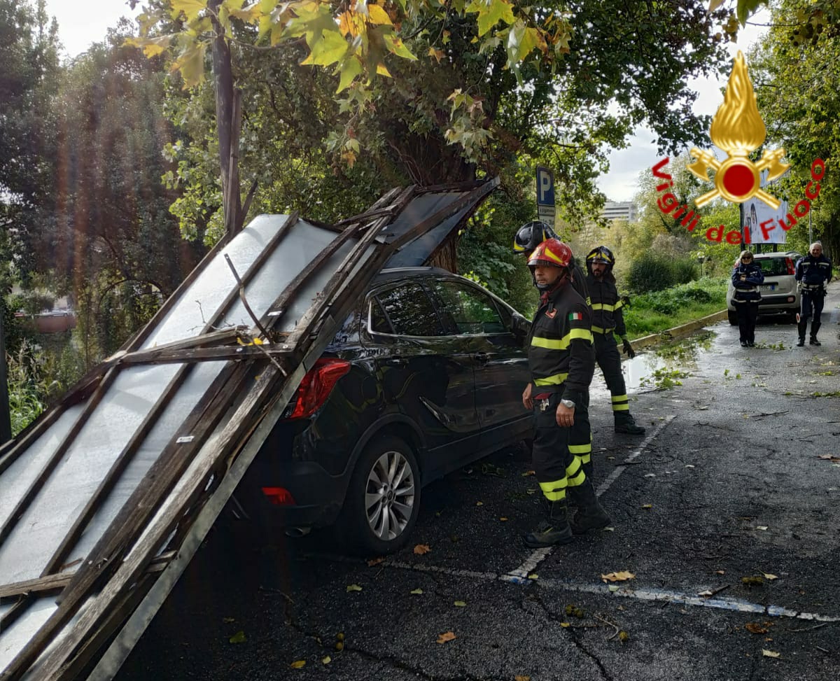 Nella città di Terni un cartellone pubblicitario divelto dal vento ha colpito un autovettura parcheggiata.