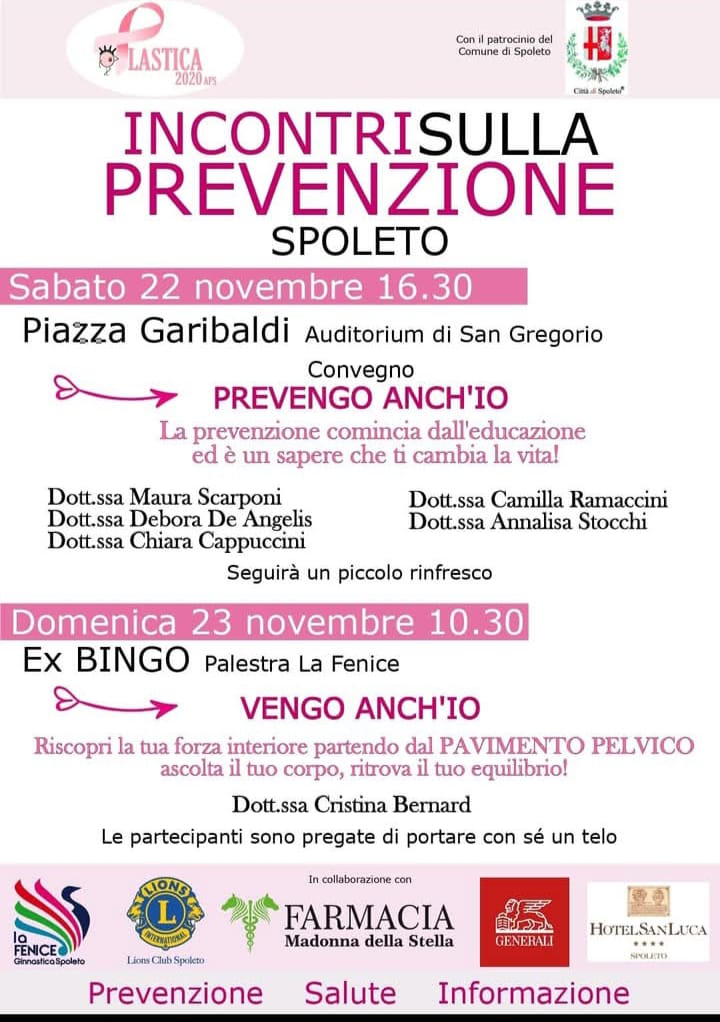 Non solo. In contemporanea, Plastica2020 ha organizzato due eventi dedicati. Sabato 22 novembre alle 16,30 presso l’Auditorium San Gregorio in Piazza Garibaldi, si terrà il convegno “PREVENGO ANCH’IO”, un incontro ricco di vari professionisti che affronteranno il tema della prevenzione. Con la Dott.ssa Maura Scarponi si parlerà di corretta alimentazione, la Dott.ssa Debora De Angelis e la Dott.ssa Chiara Cappuccini forniranno una panoramica sull’importanza di effettuare esami di screening HPV e HCV tumore al colon, la Dott.ssa Camilla Ramaccini metterà in luce l’importanza del supporto psicologico nell’affrontare il vissuto relativo alla malattia in tutte le sue fasi, dalla diagnosi al follow up, la Dott.ssa Annalisa Stocchi esporrà tematiche di diagnosi e attività preventive del tumore al seno e un rappresentante delle assicurazioni Generali presenterà prodotti assicurativi a tutela e garanzia della salute del cittadino.