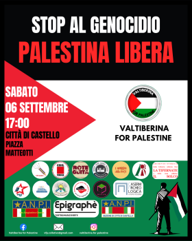 Sabato 6 settembre alle 17:00, in Piazza Matteotti a Città di Castello, si terrà una manifestazione a sostegno del popolo palestinese. L’evento vuole riunire tutti coloro che rifiutano l’indifferenza e scelgono di sostenere con forza il popolo palestinese, offrendo una giornata di interventi, testimonianze, installazioni artistiche, ma anche raccolte firme e fondi per dare voce e visibilità alla causa palestinese.