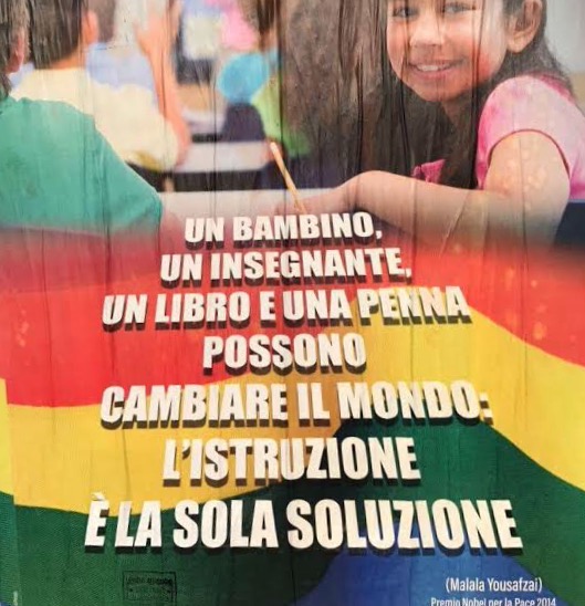 E poi una frase “Un bambino, un insegnante, un libro e una penna possono cambiare il mondo: l’istruzione è la sola soluzione“, a firma della giovanissima pachistana Malala Yousafzay, la più giovane e vincitrice del Nobel per la pace 2014, dopo essere stata gravemente ferita dai talebani per la sua lotta a favore dell’istruzione femminile. Un discorso forte e commovente sul diritto allo studio, ma anche un discorso sulla pace e sulla tolleranza.