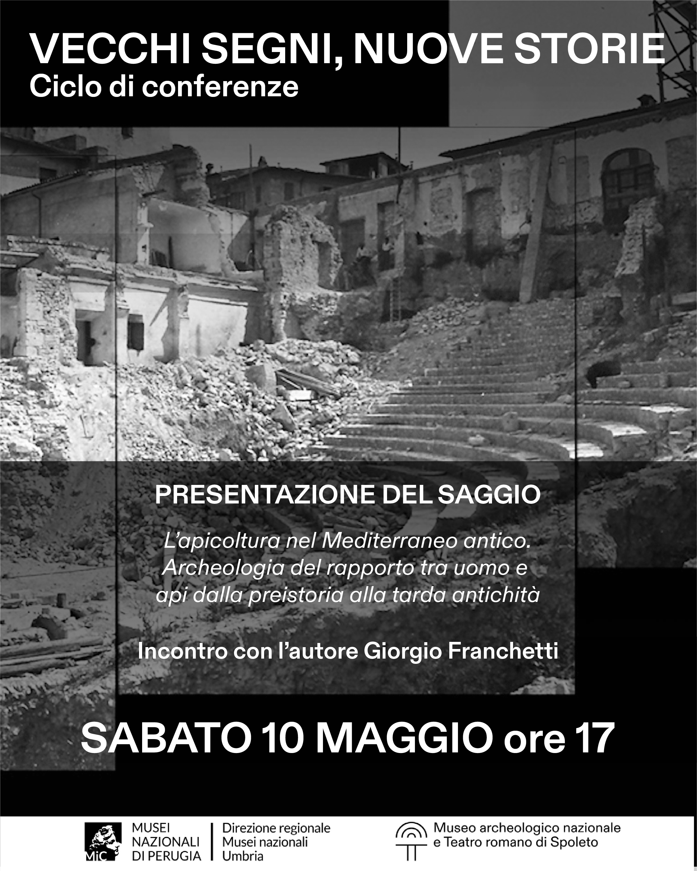 Il nuovo ciclo di conferenze di settore ‘Vecchi segni, nuove storie’ del Museo archeologico Nazionale e Teatro Romano (Mantr) di Spoleto si apre sabato 10 maggio (ore 17, chiesa di Sant’Agata) con la presentazione del saggio ‘L’apicoltura nel Mediterraneo antico. Archeologia del rapporto tra uomo e api dalla preistoria alla tarda antichità’ del divulgatore storico Giorgio Franchetti. L’evento, che sarà introdotto dalla direttrice del Mantr Silvia Casciarri, è gratuito con ingresso consentito fino ad esaurimento posti.