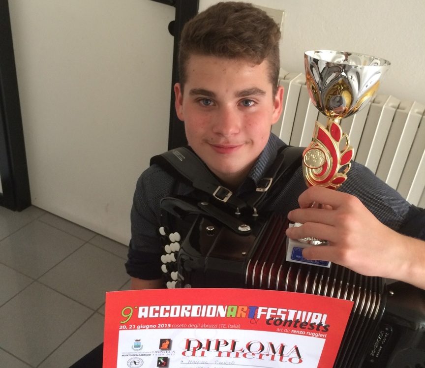 Le doti musicali di Manuel Piccioni tornano a far parlare di lui. Il giovane spoletino ha partecipato alla nona edizione dell’Accordion Art Festival & Contest, il Concorso Internazionale per fisarmonicisti che si è tenuto a Roseto degli Abruzzi aggiudicandosi il primo premio nella categoria varietè 14 anni. Un week end imperdibile quello del 20 e 21 Giugno per gli appassionati dell’affascinante strumento musicale apprezzato anche dai più giovani come dimostra la passione e l’impegno di Manuel che sin da piccolissimo ha amato la fisarmonica.