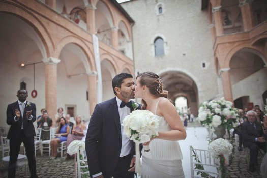 Imponente, maestosa, affascinante, la Rocca Albornoziana ha ospitato un matrimonio decisamente cosmopolita. Marta e Prem hanno scelto di sposarsi a Spoleto, città natale di lei che ha deciso di affidare l’organizzazione dell’evento a una wedding planner  visto che la coppia vive ormai da tempo all’estero dove lavora per Eni tra Congo e Mozambico.