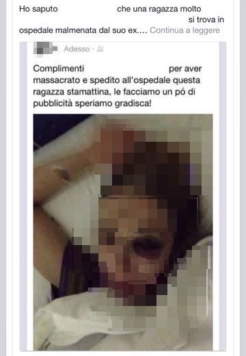 Rabbia su Facebook – intanto sui social network è esplosa la rabbia, dopo che la stessa vittima ha autorizzato alcuni suoi amici a pubblicare su Facebook la foto delle condizioni in cui versa. Nel giro di poche ore ci sono state decine e decine di condivisioni del post (in cui è stato taggato anche il colpevole) e centinaia di commenti di vario tenore. Da chi ha insultato l’energumeno con ‘vigliacco’, ‘impotente’ etc., a chi gli ha augurato di fargli provare “la stessa cosa ogni giorno per almeno 30 giorni” come ha scritto Raffaella. E ancora “sei una persona inutile” dice Giorgio, mentre Giuseppe lo invita “a passare da me, facciamo quattro chiacchiere, cosi potrai dimostrarmi quanta forza hai…” o chi vorrebbe tornare alle punizioni corporali tipo ‘quelle medievali’. Tantissimi anche i messaggi di vicinanza alla ragazza e di augurio per uscire presto dall’ospedale. Ai quali si aggiungono quelli per il coraggio mostrato nell’aver reso pubblica questa ennesima aggressione contro una donna.