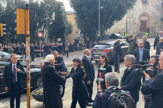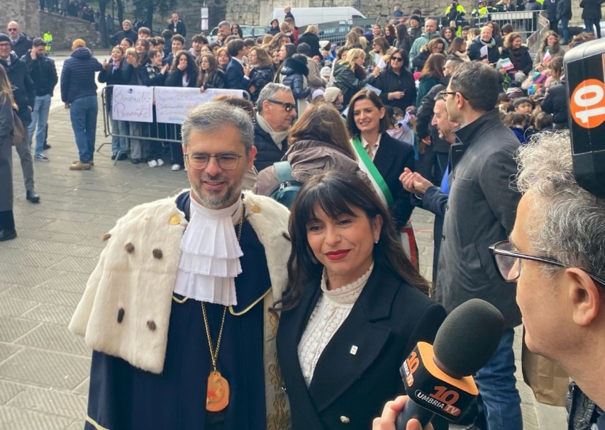 Accanto a loro ci sono gli studenti del Liceo Mariotti, che nell’attesa avevano parlato con la governatrice umbra Stefania Proietti e con la sindaca Vittoria Ferdinandi, mostrando loro il manifesto che Mattarella ha poi firmato. Le due rappresentanti istituzionali, insieme al presidente della Provincia Sandro Pasquali, accolgono in piazza Fortebraccio il Presidente della Repubblica Sergio Mattarella, arrivato per l’inaugurazione dell’anno accademico dell’Università per Stranieri.