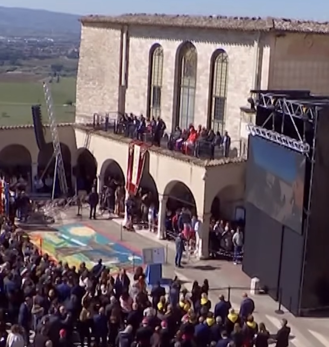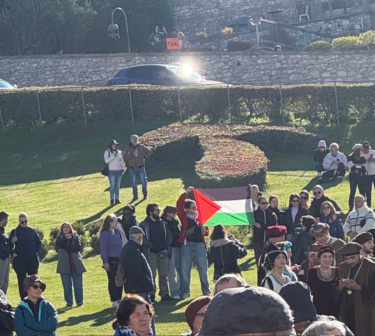 Una contestazione silenziosa al suo arrivo nella Basilica maggiore, dove alcuni manifestanti hanno esposto le bandiere della Palestina. La stessa bandiera palestinese che, insieme a quella arcobaleno della pace, era stata disegnata lungo il percorso che avrebbe seguito, come da tradizione, il corteo civile. Simboli che però sono stati lavati via prima del transito.