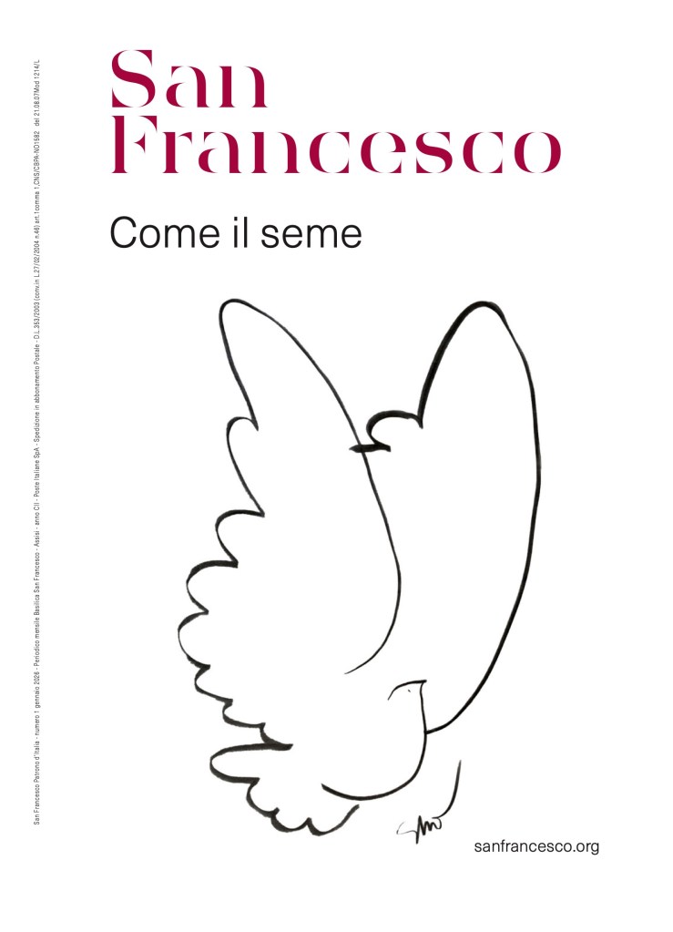 In continuità con l’apertura ufficiale del centenario avvenuta sabato 10 gennaio e in preparazione all’ostensione delle spoglie mortali del Santo dal 22 febbraio al 22 marzo 2026, la nuova uscita inaugura il nuovo piano editoriale che, assumendo il claim del centenario “San Francesco vive” – scelto dai frati del Sacro Convento e che dà il nome anche al sito web dedicato agli eventi dell’anno – è incentrato sul tema della vita. Il filo rosso del numero di gennaio è rappresentato in copertina dal titolo “Come il seme” e dal disegno dell’architetto Santiago Calatrava che raffigura la colomba della pace, condizione imprescindibile di ogni vita tout court e della qualità di ogni esistenza.