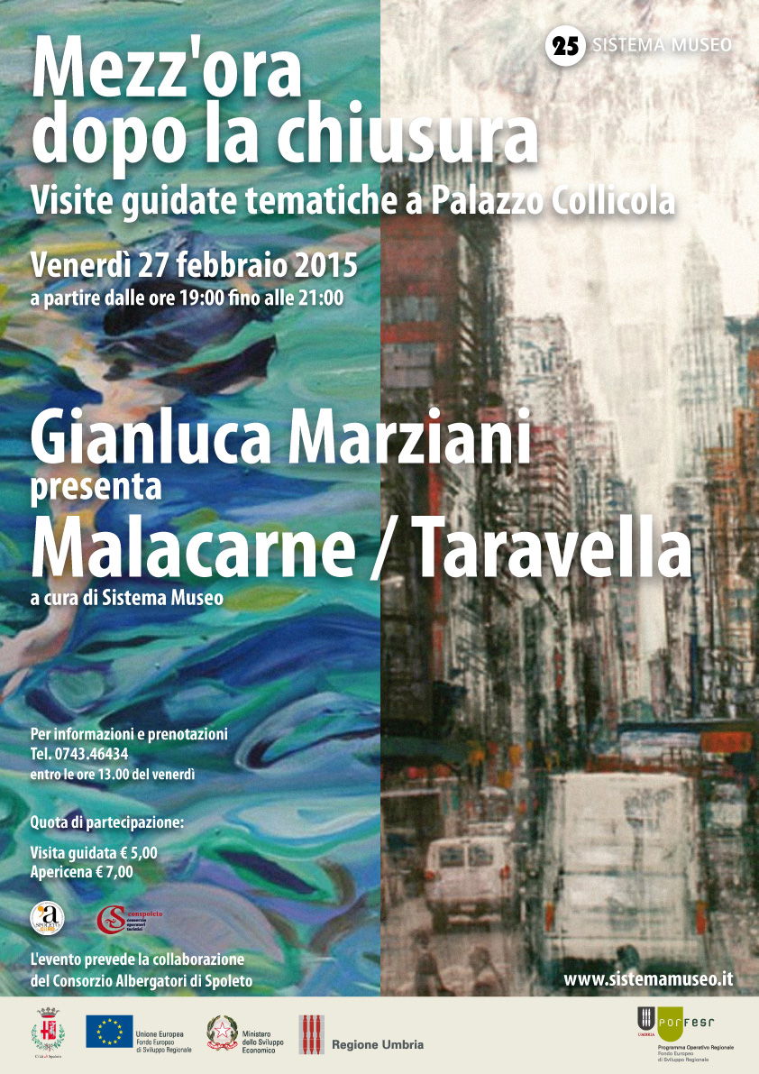 In concomitanza della chiusura delle mostre invernali di Palazzo Collicola, il cui vernisagge per la stampa è in programma sabato 28 febbraio alle 12, il direttore di Palazzo Collicola Gianluca Marziani offre a tutti i partecipanti un’ultima occasione per una visita esclusiva in sua compagnia. Tra gli artisti oggetto dell’appuntamento Claudio Malacarne, con la mostra “I sensi liquidi”, che con “uno sguardo inaspettato e mediterraneo, figlio della grande pittura italiana, ci catapulterà nella sensazione del mare trasparente, dell’acqua limpida e attrattiva, del galleggiamento tra sfumature di verde e blu”.