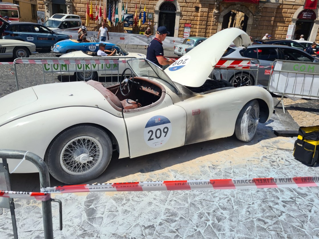 Durante il controllo orario della competizione sportiva, un’autovettura Mercedes proveniente dalla California, impegnata per la timbratura insieme alle altre auto, ha però preso fuoco. Il tutto mentre in piazza c’erano numerosi appassionati e turisti.