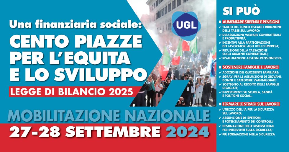 Il giorno 27 e 28 settembre 2024, dalle ore 10 alle 17, in Umbria, si terrà la mobilitazione nazionale Ugl “Cento piazze per l’equità e lo sviluppo” saremo presenti con gazebo e volantini informativi a Perugia, Terni e Umbertide, per ribadire con forza le proposte del sindacato, tutte indirizzate a valorizzare il carattere sociale della prossima Legge di bilancio che il Governo si appresta a varare e che il Parlamento dovrà approvare entro il 31 dicembre. «Il 2025 può e deve essere l’anno della svolta definitiva. Malgrado segnali di ripresa evidenti, persiste la percezione di incertezza in cui si trova l’Italia e che pesa sull’economia e sulle famiglie. Per questo scendiamo in piazza, – dichiara Roberto Perfetti, segretario della Ugl Umbria – per chiedere di dare sostegno alle famiglie e ai settori produttivi, valorizzando gli elementi positivi emersi a partire dal 2022, soprattutto in materia di occupazione e di progressivo recupero del potere d’acquisto degli stipendi. In particolare, l’Ugl chiede una nuova politica dei redditi e la rivalutazione delle pensioni, fermare le stragi sul lavoro e sostenere le famiglie e l’occupazione. Per quanto riguarda il sostegno al potere d’acquisto, chiederemo di inserire nella manovra il taglio del cuneo fiscale, la detassazione di welfare aziendale, premi di produttività ed aumenti contrattuali, incentivi alla partecipazione dei lavoratori agli utili d’impresa, la rivalutazione degli assegni pensionistici».