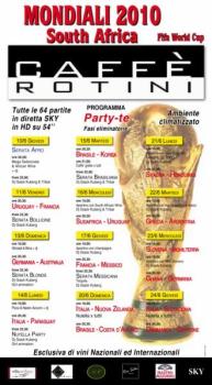 I Mondiali di calcio sono alle porte e anche chi non è un fan sfegatato dello sport italiano per eccellenza segue con la coda dell'occhio almeno una delle partire della nostra Nazionale che proprio in questi giorni è impegnata in Sud Africa con la preparazione. Si parte l'11 Giugno con Sud Africa – Messico e poi a seguire le partite dei gironi, dalla A alla H, passando per gli ottavi, i quarti, le semifinali fino all'attesissima finale dell'11 Luglio alle ore 20.30. Il Caffè Rotini ha pensato bene di offrire l'oppportunità a tifosi accaniti o occasionali di vedere tutte le 64 partite del mondiale in diretta in Alta Definizione scegliendo tra 2 schermi da 54″ unendo anche l'opportunità di degustare vini provenienti da diverse parti del mondo tanto per rimanere in tema.