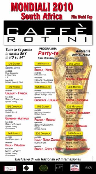 I Mondiali di calcio sono alle porte e anche chi non è un fan sfegatato dello sport italiano per eccellenza segue con la coda dell'occhio almeno una delle partire della nostra Nazionale che proprio in questi giorni è impegnata in Sud Africa con la preparazione. Si parte l'11 Giugno con Sud Africa – Messico e poi a seguire le partite dei gironi, dalla A alla H, passando per gli ottavi, i quarti, le semifinali fino all'attesissima finale dell'11 Luglio alle ore 20.30. Il Caffè Rotini ha pensato bene di offrire l'oppportunità a tifosi accaniti o occasionali di vedere tutte le 64 partite del mondiale in diretta in Alta Definizione scegliendo tra 2 schermi da 54″ unendo anche l'opportunità di degustare vini provenienti da diverse parti del mondo tanto per rimanere in tema.