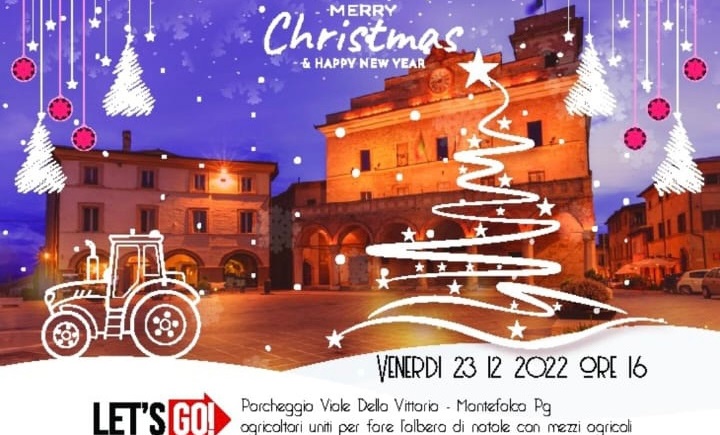 Un albero di Natale composto da trattori, questa l’idea degli agricoltori per fare gli auguri da Montefalco, già sperimentata nei giorni scorsi ad Umbertide con 30 mezzi agricoli.
