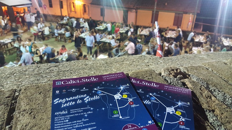 Kit degustazione in mano, calice a tracolla, scarpe comode e via! Questo il mood con il quale centinaia e centinaia di persone hanno affrontato la notte delle stelle cadenti a Montefalco dove il Consorzio Tutela Vini, in collaborazione con il Comune, ha organizzato ancora una volta una riuscitissima edizione di Sagrantino sotto le Stelle, declinazione della manifestazione nazionale Calici di Stelle. Taverne gremite e punti degustazione con appassionati di vino pazientemente in fila ad aspettare il proprio turno per scegliere quale tra i vini proposti assaggiare.