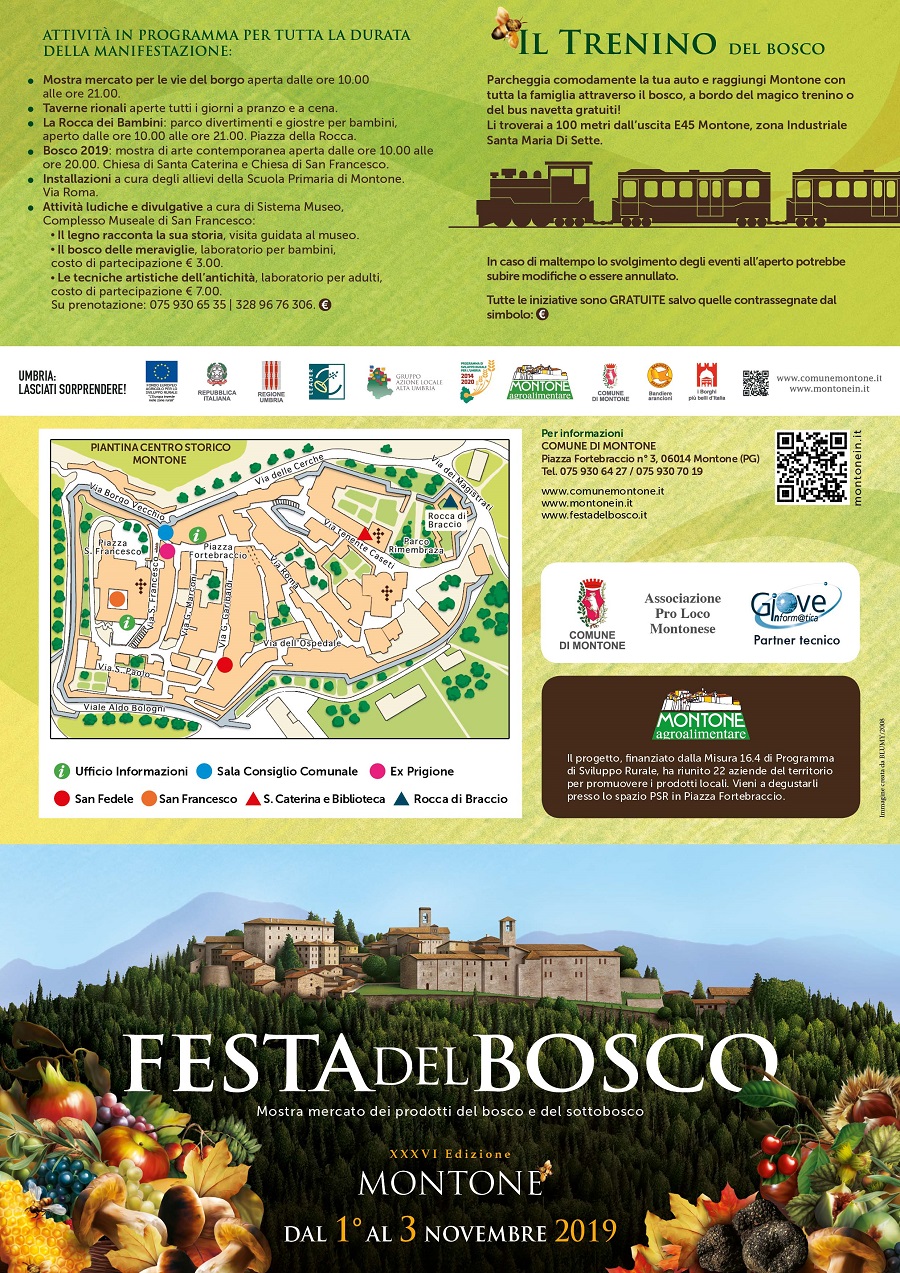 Montone si conferma al passo coi tempi dando spazio all’ecologia e al divertimento ”green”. Viene riconfermata anche quest’anno la presenza del Trenino del Bosco: un servizio navetta gratuito che consentirà di raggiungere il centro storico parcheggiando la macchina a pochi metri dall’uscita della E45. Un metodo ecologico, pratico e bellissimo per vivere la festa. Da segnalare, inoltre, i momenti dedicati ai bambini: dalle Letture ad alta voce organizzate dalla Biblioteca Comunale e le sue volontarie, ai Raccontastorie, dalle esibizioni di swing, a quelle di magia. In particolare, domenica pomeriggio si terrà la proiezione dei cortometraggi realizzati dai bambini delle scuole di Montone e del Campus da Vinci di Umbertide attraverso il progetto Action Movies, organizzato da Umbria Film Festival col sostegno di Miur e Mibac.