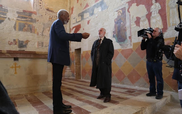 Dopo la “passeggiata” davanti alle telecamere in piazza IV Novembre, l’attore Morgan Freeman ha girato le riprese della terza edizione del documentario “Story of God” all’interno della chiesa di San Bevignate, il tempio dei cavalieri templari, di cui conserva uno dei più importanti cicli di affreschi.