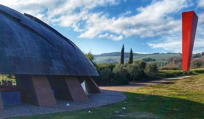 Molte delle sue opere si trovano anche sparse per l’Umbria, dall’obelisco – Lancia di Luce – di Terni a Spoleto, con la Colonna del Viaggiatore nei pressi della stazione ferroviaria, fino alle steli di Todi. Infine anche il notissimo “Carapace” a Bevagna (nella foto), l’unica scultura al mondo che ospita al suo interno una cantina.