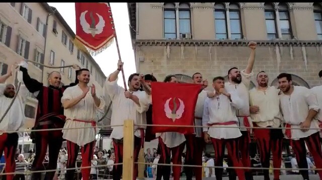 Rione Sant’Angelo scatenato in questa edizione del palio di Perugia 1416. Dopo aver trionfato nel tiro del giavellotto con i Cintioli (padre e figlio), il Rione del capitano Paolo Pizzichelli domina anche la Mossa alla Torre, superando nel testa a testa finale Porta Santa Susanna.