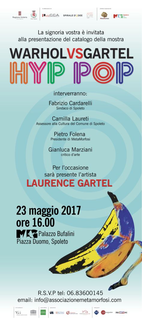 Interverranno, oltre a Gartel, Fabrizio Cardarelli, sindaco di Spoleto; Camilla Laureti, assessore alla Cultura del Comune di Spoleto; Pietro Folena, presidente di Metaforfosi; Gianluca Marziani, critico d’Arte. La mostra Warhol vs Gartel. Hyp Pop a Palazzo Bufalini in Piazza Duomo, dallo scorso dicembre, ha portato la pop-art a Spoleto, presentando uno dei confronti artistici più stimolanti degli ultimi anni. Il suo indiscusso maestro Andy Warhol (1928 Pittsburgh – 1987 New York) e Laurence Gartel (1956 New York), uno dei più famosi esponenti della sua declinazione in “formato” digitale, si affrontano in un’inedita “sfida” al MAG MetaMorfosi Art Gallery di Piazza Duomo con cinquanta opere originali di entrambi gli artisti. La mostra, prodotta e organizzata dall’Associazione MetaMorfosi in collaborazione con Spirale di Idee e Artelite, e curata da Maurizio Vanni direttore del  Lu.C.C.A. (Lucca Center of Contemporary Art), con il patrocinio del Comune di Spoleto e della Regione Umbria, vede confrontarsi due mondi affini, quello della Pop Art e dell’Arte Digitale, che hanno profondamente trasformato, dalla fine degli anni ’70 in poi, il comune senso dell’Arte.