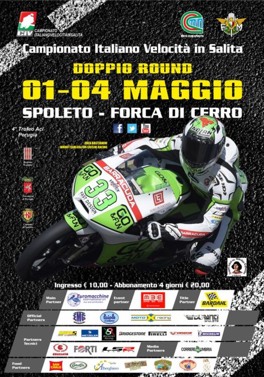Per l’occasione, complice anche il lungo ponte del 1° maggio, il Moto Club Spoleto ha organizzato una quattro-giorni all’insegna dello spettacolo e della grande velocità. Già da giovedì 1° maggio, infatti, gli oltre 2 chilometri di tracciato della Spoleto-Forca di Cerro inizieranno ad animarsi con i protagonisti delle varie classi del campionato Italiano. Tra giovedì e venerdì, infatti, saranno ben 9 i turni di prove libere che permetteranno a tutti i piloti di prendere la maggior confidenza possibile con il tracciato, in maniera da scatenare tutti i cavalli possibili sull’asfalto in occasione delle due gare.