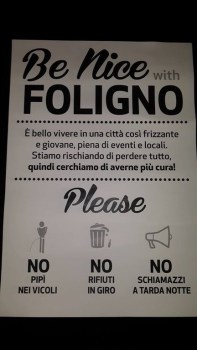 “E’ bello vivere in una città frizzante e giovane, piena di eventi e locali. Stiamo rischiando di perdere tutto, quindi cerchiamo di averne più cura!” E’ quanto scritto a chiare lettere sulla locandina intitolata “Be nice with Foligno”, affissa nelle vetrine di enoteche, pizzerie, ristoranti e osterie.