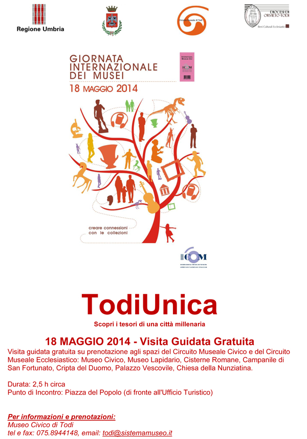 Domenica 18 maggio il Circuito museale di Todi, in collaborazione con la Diocesi di Orvieto-Todi, aderisce alla “Giornata Internazionale dei Musei” 2014 promossa dall’ICOM (International Council of Museums) con la visita guidata gratuita agli spazi del percorso “Todi Unica – I Tesori di una città”. Un’occasione unica per attraversare la storia millenaria della Città di Todi.