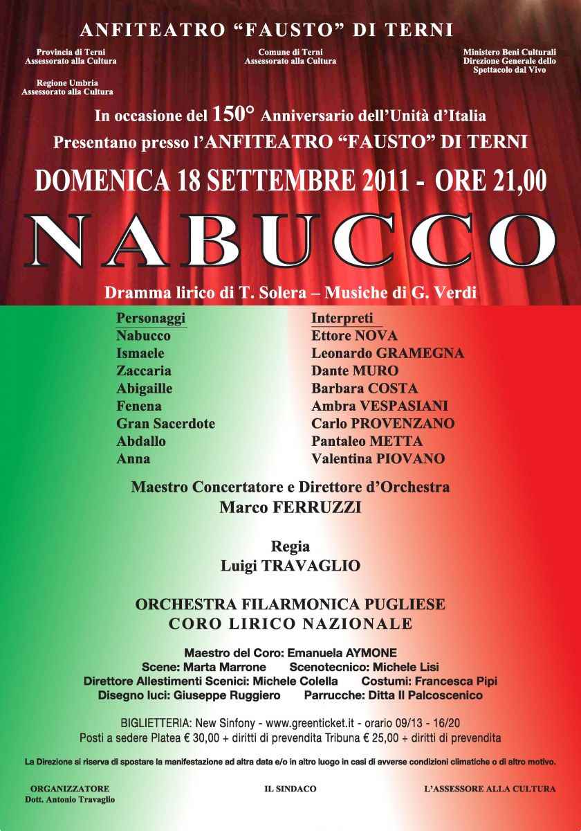 La rappresentazione del Nabucco all'Anfiteatro Fausto di Terni è stata rinviata al 1° ottobre. Le previsioni meteo per il fine settimana, infatti, non sono davvero clementi, particolarmente per la serata di domenica, data in cui era stata fissata l'opera. La pioggia praticamente certa ha portato gli organizzatori, in accordo con l'assessorato alla cultura del Comune di Terni, a decidere di spostare la messa in scena a SABATO 1° OTTOBRE, sempre all'Anfiteatro e sempre alle 21. La prevendita per una delle opere più famose e intense di Giuseppe Verdi continua, quindi, presso New Sinfony (Terni – Galleria del Corso) e sul sito www.greenticket.it.