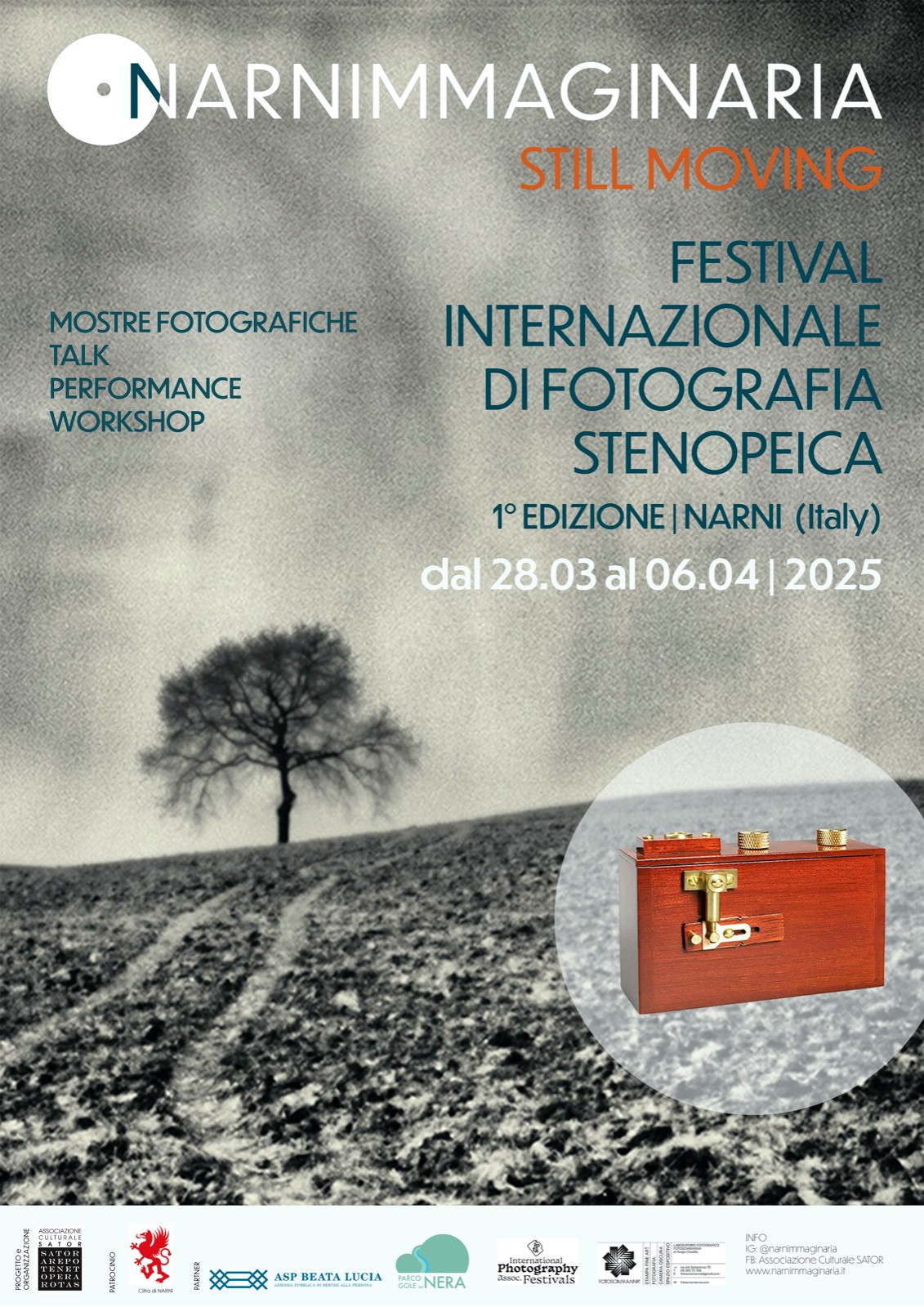 Dal 28 marzo al 6 aprile 2026, NARNIMMAGINARIA inaugura una nuova fase della propria ricerca curatoriale trasformandosi in NARNIMMAGINARIA – STILL MOVING, prima edizione del Festival Internazionale interamente dedicato alla fotografia stenopeica e alle pratiche artistiche “slow”. La manifestazione è promossa da SATOR APS e patrocinata dal Comune di Narni e da Beata Lucia Aps.