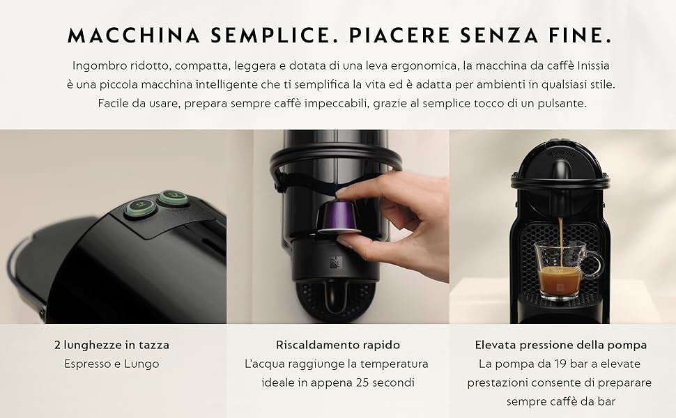 La Nespresso Inissia utilizza capsule OriginalLine, garantendo un’estrazione costante e un aroma intenso, tazza dopo tazza. In meno di 30 secondi è pronta all’uso, con due pulsanti programmabili per espresso e lungo.