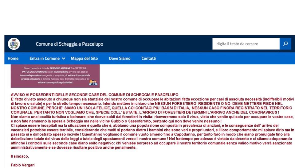 Il comunicato, rivolto ai possedenti delle seconde case del Comune, recitava: “E’ fatto divieto assoluto, a chiunque non sia stanziale del nostro Comune, di occupare le abitazioni, fatta eccezione per casi di assoluta necessità e per lo stretto necessario. Nessun forestiero deve mettere piede nel nostro Comune, perché siamo un’isola felice, quella coi contagi più bassi d’Italia (di Covid-19, ndr) nessun caso finora registrato nel territorio comunale“.