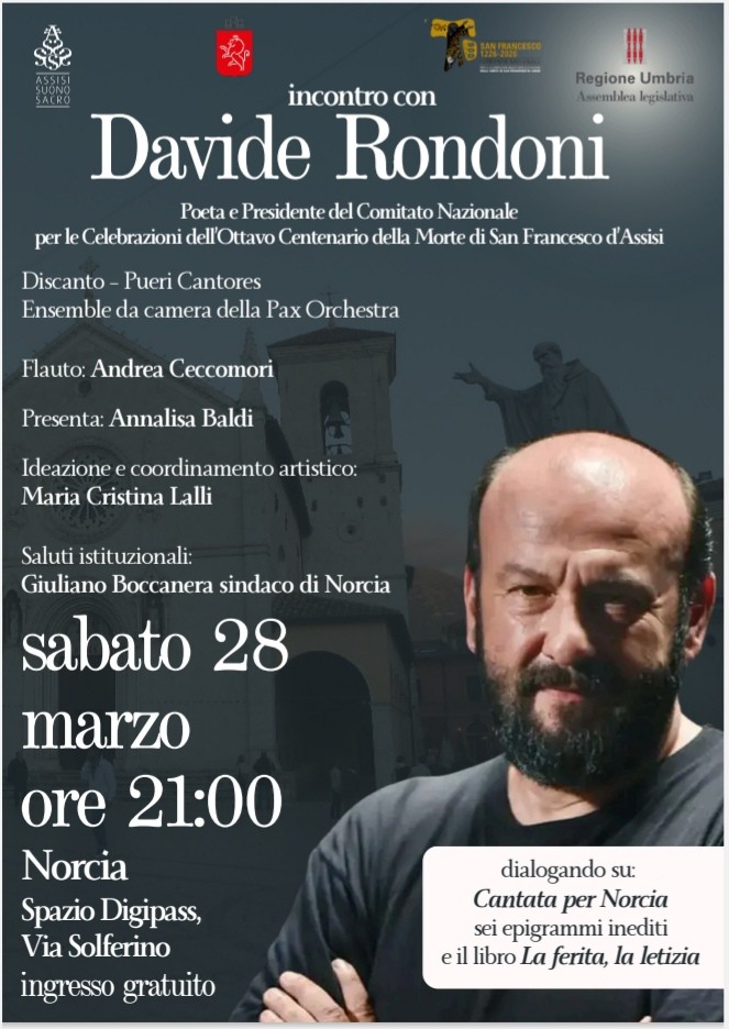 Norcia – Nel cuore dell’Umbria ferita e resiliente, la parola poetica torna a farsi gesto civile. Il prossimo 28 marzo 2026, alle ore 21.00, lo Spazio Digipass di Norcia ospiterà un incontro con Davide Rondoni, tra le voci più autorevoli della poesia contemporanea italiana e figura di rilievo anche nel panorama internazionale.