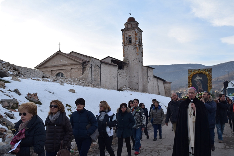 E questo è tornata a fare ieri pomeriggio, su impulso dell’arcivescovo Renato Boccardo, quando si è tenuta, intorno alle mura cittadine di Norcia, la processione penitenziale con l’immagine appunto della Madonna Addolorata estratta dalle macerie dal terremoto. È stato il secondo momento, dopo la giornata di digiuno di venerdì 27 gennaio, pensato da mons. Boccardo che per chiedere a Dio, creatore dell’universo, di porre fine alle forze della natura, in particolare al sisma che ha sconvolto l’Italia centrale, tra cui la Valnerina patria di San Benedetto e di Santa Rita. Ancora una volta sono tanti i fedeli accorsi per questo ulteriore momento di preghiera, per chiedere alla Vergine, Madre di Gesù e Madre nostra, protezione attraverso la sua misericordia.