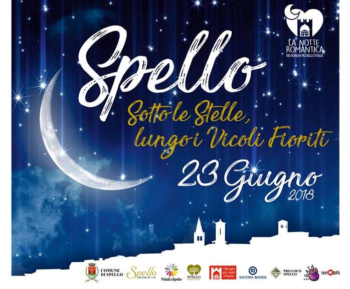 Una notte interamente dedicata all’amore in ogni sua accezione: sabato 23 giugno Spello si prepara a festeggiare la Notte romantica, una serata dedicata a tutti gli innamorati che nella magica atmosfera dei vicoli fioriti potranno ascoltare dell’ottima musica, gustare del buon cibo e passeggiare sotto le stelle.