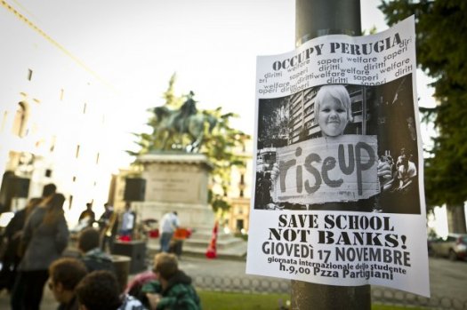 Uno scarno gruppo di ragazzi, appartenenti a diverse sigle partitiche ed associazioni, tra cui Cultura e Conflitto, Giovani Comunisti e Rifondazione Comunista, si sono incontrati questa mattina, come da programma, in Piazza Italia, per la manifestazione Occupy Perugia. Le proteste contro la crisi economica internazionale, portanno l'eco delle manifestazioni degli Indignados di tutto il mondo e precedono la manifestazione che si terrà giovedì 17 novembre, con partenza alle 9 da Piazza Partigiani, per la giornata internazionale dello studente, il cui slogan recita “Save school, not banks”. Presenti anche diversi i precari del mondo del lavoro. Una manifestazione pacifica, con un solo fumogeno sventolato in aria, e un concerto live tenuto dal gruppo perugino The Skaouts.