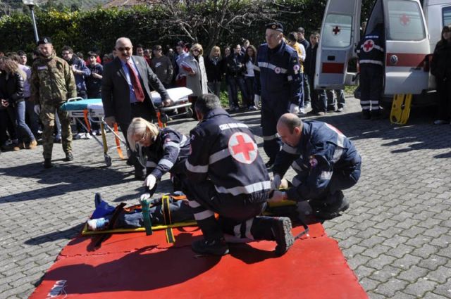 Prova di esodo da scossa sismica all'ITIS/IPSIA e al Liceo “Pontano Sansi Leonardi” di Spoleto La Croce Rossa soccorre contusi e feriti: ma si tratta di una simulazione Ore 11.30 di sabato: nell'Istituto che accoglie l'ITIS/IPSIA, il Liceo Classico e il Liceo Linguistico “Pontano Sansi – Leonardi” di Spoleto, tre squilli di campanella diffondono l'allarme da scossa sismica. Studenti, Docenti, Personale ATA evacuano in fretta e con ordine l'edificio. Ma la scossa ha provocato la frantumazione di alcune vetrate, e diversi ragazzi, che hanno riportato ferite da taglio, sono accasciati lungo i corridoi. Un alunno, nella fuga, è caduto, riportando la frattura esposta della tibia. In soccorso ai feriti interviene la Croce Rossa Italiana, con barella spinale, barella a cucchiaio, sedia cardiologica. All'aperto, negli appositi presidi, collari e bendaggi vengono posti a protezione degli arti. Fortunatamente, si è trattato di una simulazione di prova di esodo, organizzata dall'Istituto Tecnico e dal Liceo Classico e Linguistico di Spoleto in forme estremamente realistiche e con grande dispiegamento di mezzi, e resa possibile grazie all'eccezionale supporto della Croce Rossa Italiana. Le sezioni di Foligno e Spoleto hanno partecipato con un nutrito gruppo, formato dall'esponente del Corpo Militare Sottotenente Commissario Sergio Bovini, 4 Pioniere, guidate dall'Ispettrice Elisabetta Mastrofabi, specializzate nel trucco simulativo, 8 Volontari del Soccorso, di cui 5 del Gruppo Spoleto e 3 del Gruppo Foligno. A coordinare la squadra il Tenente Commissario Alberto Raponi. Molto soddisfatta la Dirigente dell'ITIS/IPSIA, Fiorella Sagrestani, che ha ricordato l'attenzione con cui nell'Istituto si curano i diversi aspetti della sicurezza. “La scuola – ha dichiarato la Dirigente Sagrestani – dedica molte energie al tema della prevenzione, del benessere, della salute. Normalmente le simulazioni di prova di evacuazione sono più semplici, ma grazie alla disponibilità della Croce Rossa abbiamo fatto vivere agli Studenti, in modo protetto, diversi aspetti di una tipologia di evento a cui occorre essere preparati, per poterlo affrontare con sicurezza e quasi con automatismo. In certi momenti bisogna sapere esattamente cosa fare, per mettersi in sicurezza e per agevolare i soccorsi”. Di eguale tenore le parole della Dirigente del Liceo Classico e Lingustico, Roberta Galassi. “I ragazzi – ricorda la Galassi – sono stati molto colpiti dall'intervento dei volontari della Croce Rossa. Hanno potuto osservare le tecniche e gli strumenti utilizzati, le manovre più semplici, e quelle che possono salvare la vita. Soprattutto hanno apprezzato lo spirito di corpo e i valori a cui si ispirano gli uomini e le donne della nostra Croce Rossa: solidarietà, generosità, altruismo, spirito di civiltà e grande responsabilità”. Il Tenente Commissario Alberto Raponi, tra l'altro anche Vice Preside dell'IIS di Spoleto, ha ricordato che alcuni dei volontari intervenuti alla simulazione sono stati impegnati a L'Aquila a sostegno delle popolazioni colpite dal sisma, situazione di reale e dolorosa emergenza, in cui hanno dato prova di preparazione e competenza, ma anche di una sensibilità umana inarrivabile, nel più spirito di servizio della Croce Rossa. Molto soddisfatto anche il Sottotenente Sergio Bovini, geologo impegnato nella Protezione Civile, grande esperto dei temi della sicurezza e prevenzione, che ha auspicato, per il prossimo anno, l'attuazione di un intervento formativo ancora più approfondito rivolto agli Studenti dei due Istituti. Una proposta che è in cantiere da tempo e che le due Dirigenti hanno accolto, perché a scuola è importante apprendere conoscenze culturali ma, prima di tutto, è essenziale imparare a tutelare salute, sicurezza e benessere.
