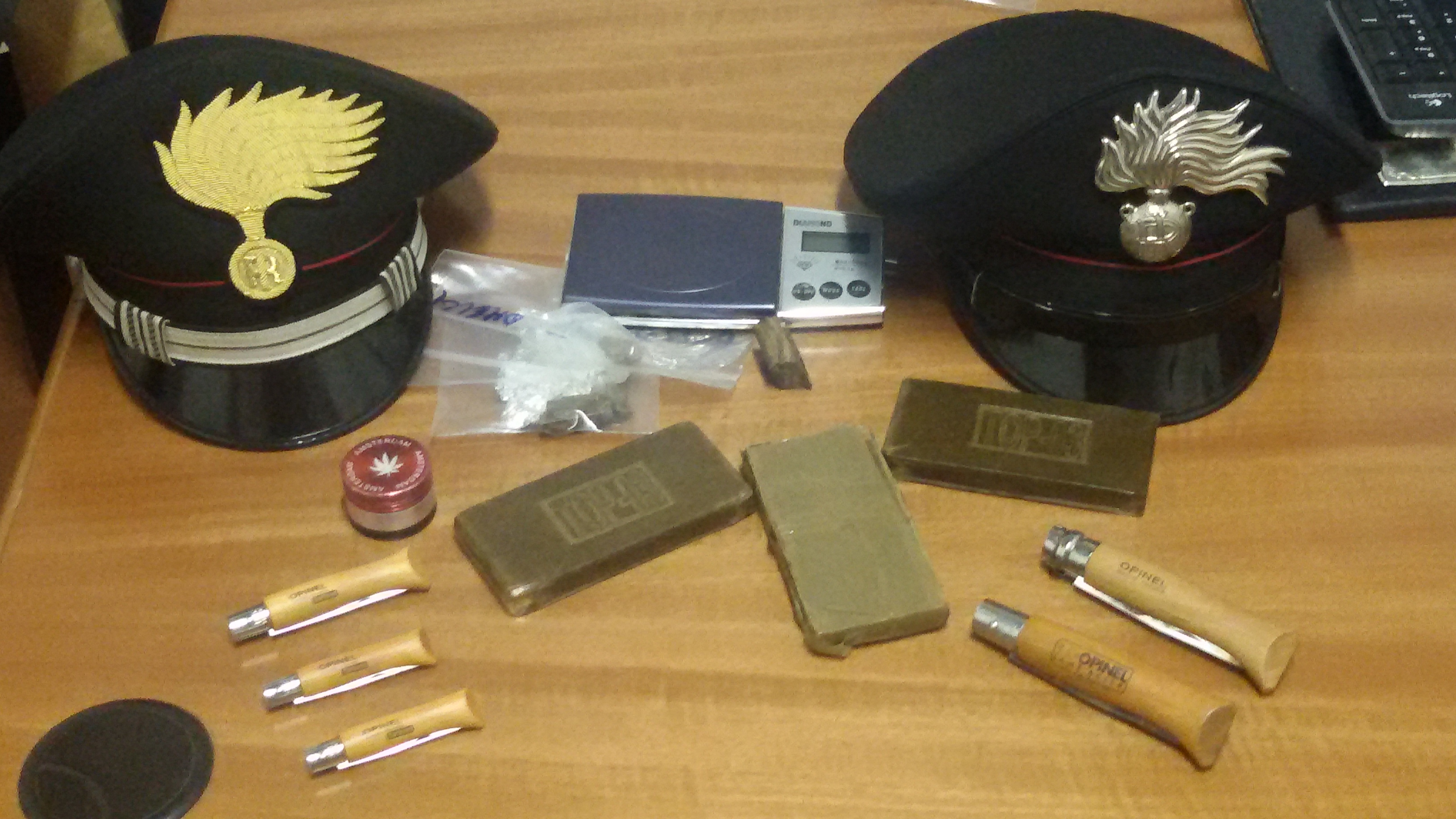 Oltre a sequestrare occultati sulla sua persona i 40€ frutto della cessione “in diretta” ed ulteriori 2 grammi del medesimo stupefacente, i militari hanno trovato a casa del 32enne il vero “bottino”. Infatti, ben nascosti nella camera da letto del pusher, i Carabinieri hanno trovato e sequestrato 3 panetti da 100 grammi di hashish, tutto l’occorrente per la pesatura ed il confezionamento delle dosi e 5 coltelli a serramanico con lame di varie lunghezze.