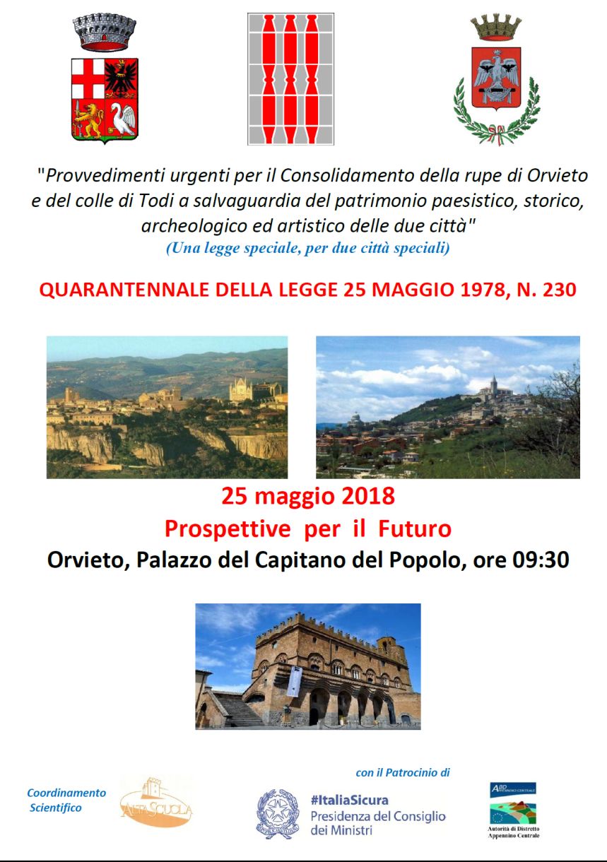 Venerdì 25 Maggio 2018, con un incontro pubblico che si terrà al Palazzo del Capitano del Popolo di Orvieto / Centro Congressi, i Comuni di Orvieto e Todi, la Regione Umbria ed Alta Scuola, avviano le celebrazioni del QUARANTENNALE DELLA LEGGE 230/78, che rappresentò per quegli anni un “cambio di passo” una “rivoluzione culturale” innovativa nel campo della tutela attiva, della cura e manutenzione del territorio, per il modo con cui venne ideato, approcciato e condotto.