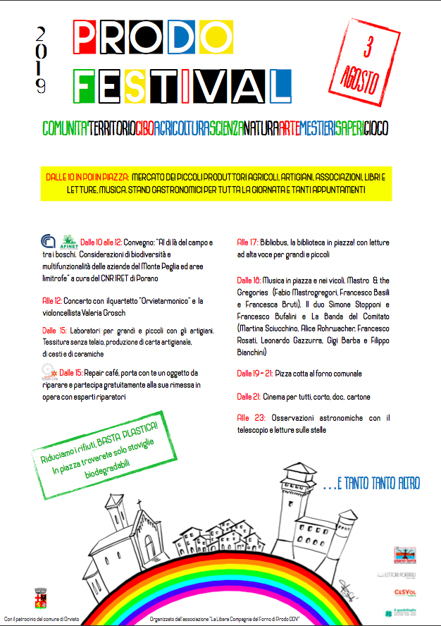 Il Prodo Festival, organizzato dall’associazione “Libera compagnia del forno di Prodo odv”, inizierà col convegno “Al di là del campo e tra i boschi. Considerazioni di biodiversità e multifunzionalità delle aziende del Monte Peglia ed aree limitrofe” a cura del Cnr Iret di Porano.