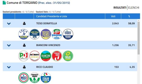Il primo partito a Torgiano si conferma la Lega con 1.118 voti (33,40%). Primi due posti per due eletti in Consiglio, Valerio Mancini (117) e Francesca Peppucci (110), evidentemente ben sostenuti dal partito. Così come Stefano Pastorelli (47), Paola Fioroni (37) ed Eugenio Rondini (9).