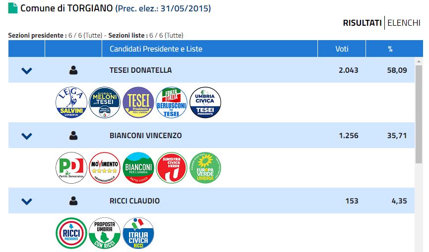 La lista Tesei Presidente qui ha però preso l’8,49%, più del risultato complessivo nella regione. Così come in linea con il dato regionale è quello della candidata presidente Donatella Tesei.