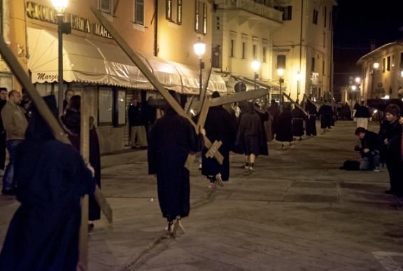 La Processione,che rievoca la passione di Cristo, muove dalla Collegiata di Santa Maria lungo le vie della cittadina, illuminate per l’occasione con lumini e torce. Il grido lamentoso delle donne e degli uomini che all’unisono intonano il Miserere, e lo strisciare impetuoso delle catene che i Penitenzieri, rigorosamente incappucciati, legano ai piedi nudi, per rendere ancora più aderente il loro incedere alla salita sul Golgota, sono gli unici squarci sonori di questa notte carica di misteri.