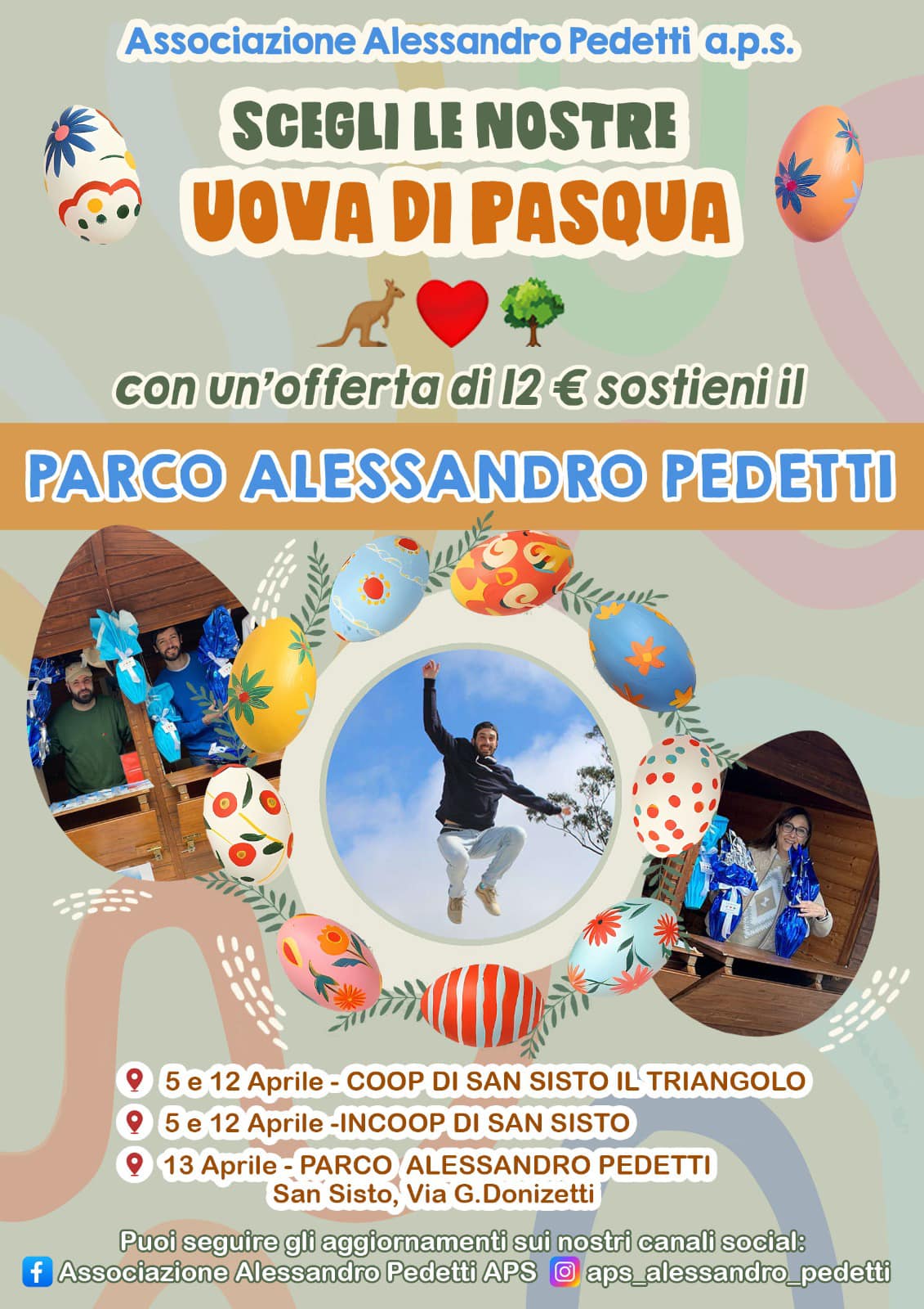 “A Pasqua fai una scelta solidAle!” è l’invito che l’Associazione “Alessandro Pedetti” rivolge a tutti coloro che vogliono addolcire la prossima Pasqua con del buon cioccolato a cui aggiungere anche il dolce sapore di una buona azione. Un contributo concreto per continuare a rendere – ad un anno dall’inaugurazione – il Parco “Alessandro Pedetti” di San Sisto un luogo di socialità ed aggregazione, capace di valorizzare l’enorme potenziale che esiste nel gesto quotidiano dello stare insieme in un luogo bello, curato, vissuto e gestito dalla collettività. Un parco vivo, verde, accogliente e pieno di giochi, opportunità e allegria, come lo avrebbe voluto Alessandro.
