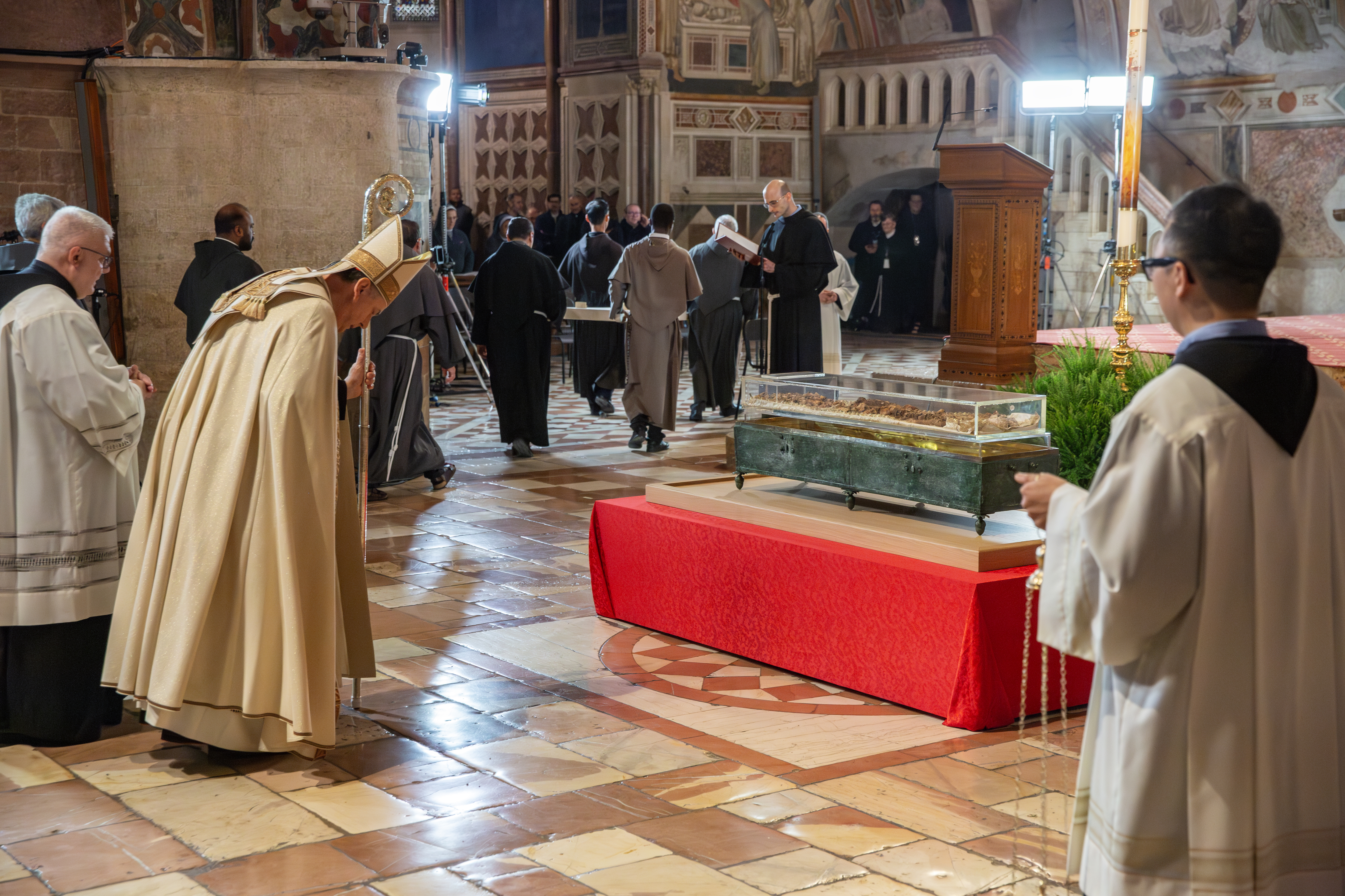Fin dalle scorse settimane, la preparazione dell’ostensione ha visto momenti significativi, come la prima ispezione del sarcofago nella notte del 9 gennaio scorso, alla presenza del vescovo diocesano, monsignor Sorrentino. Questa mattina a partire dalle 9 si è proceduto – alla presenza tra gli altri di diversi frati della comunità – all’estumulazione dei resti mortali di san Francesco dal sarcofago in cui riposano. sono stati deposti su una mensa preparata ad hoc nella cripta della Basilica. Da lì è cominciata la celebrazione della traslazione – a partire dalle 16 – e dei vespri in chiesa inferiore alla presenza di circa 300 frati. La celebrazione – presieduta dal cardinale Ángel Fernandez Artime, legato pontificio per le Basiliche papali di Assisi – è stata trasmessa in diretta su Rai1 all’interno del programma “A sua Immagine”.
