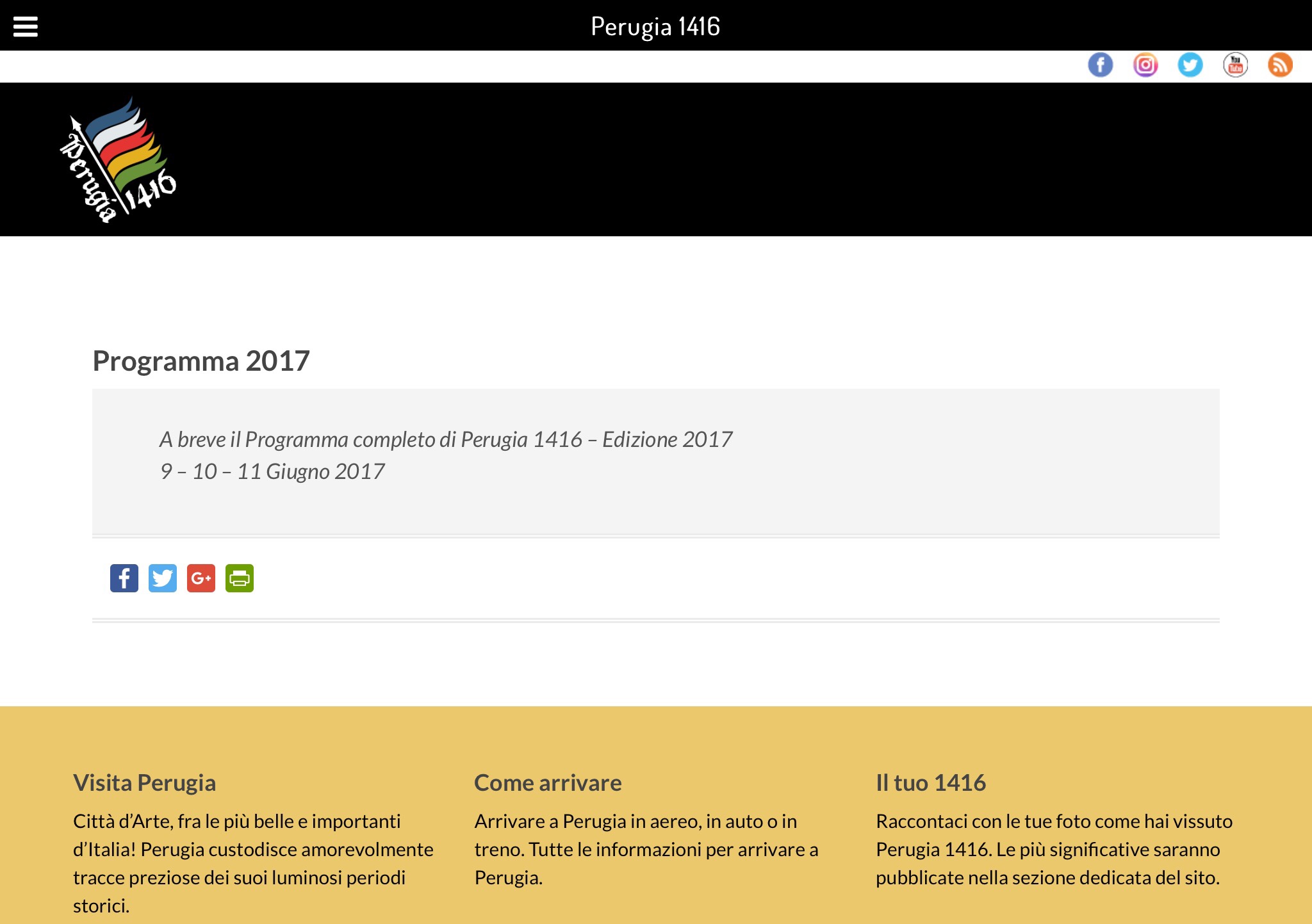 Di fatto, ad esempio, sul sito ufficiale dell’associazione Perugia 1416 un programma dettagliato ancora non c’e e, a parte qualche manifesto pubblicitario per le strade della città non è facile avere informazioni. Anche nell’ufficio al turismo in piazza Matteotti, tappa obbligata di stranieri e italiani per la prima volta in visita a Perugia, informazioni dettagliate non ce ne sono. Sulla bacheca trovinano la locandina dell’evento ma alla richiesta di ulteriori dettagli sul programma il personale addetto scuote la testa “Consigliamo i turisti di visitare il sito ufficiale dell’Associazione dove, come viene specificato, a breve verranno pubblicati ulteriori dettagli sul programma“. Secondo indiscrezioni il programma verrà illustrato il primo giugno durante la conferenza stampa di presentazione dell’evento, ad una settimana dal taglio del nastro.