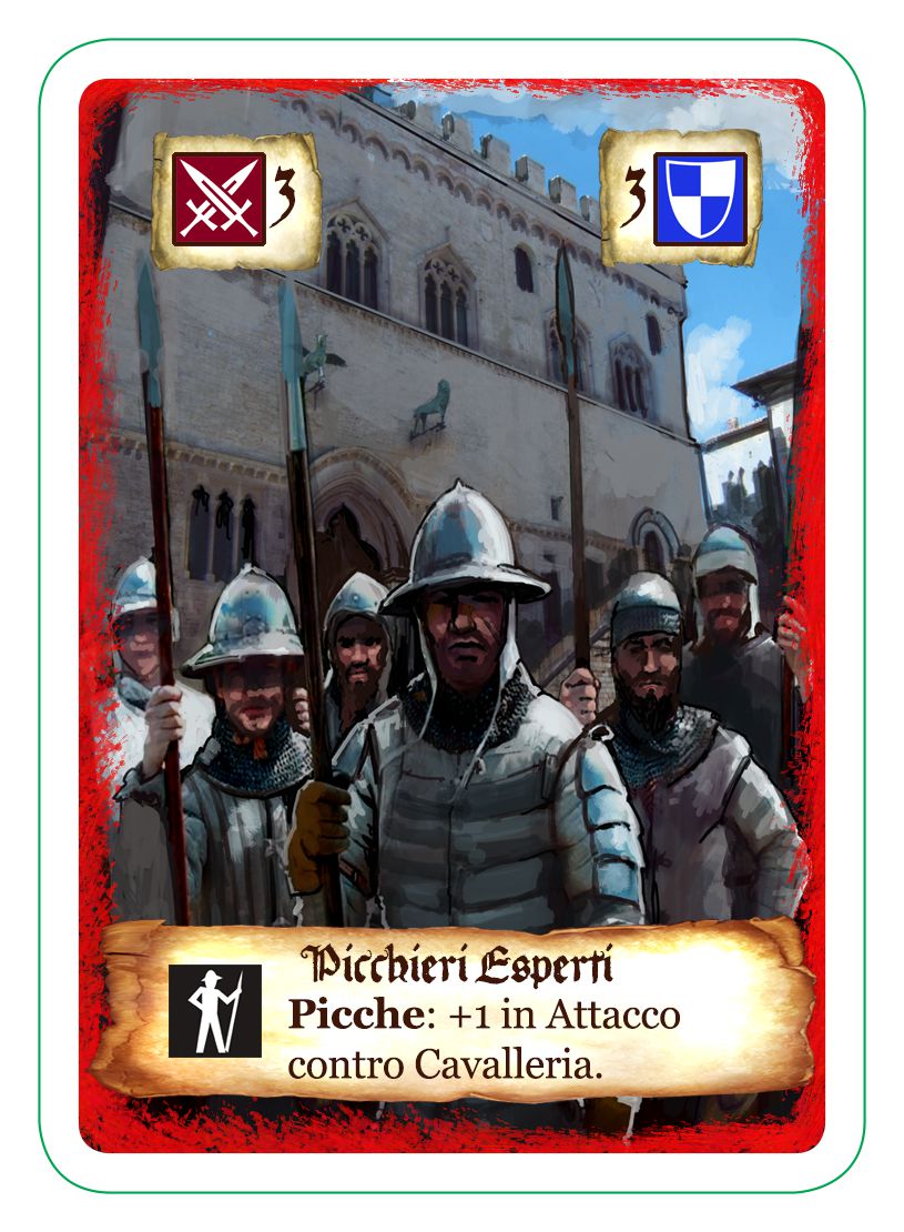 Il gioco. Ognuno dei due giocatori sceglie un condottiero a capo del proprio esercito. Sono disponibili personaggi storici come Braccio da Montone, Erasmo da Narni, detto il Gattamelata, il Carmagnola. Le altre carte del giocatore rappresentano le truppe del condottiero. Le carte vengono giocate coperte: fa parte dell’abilità necessaria a vincere la partita cercare di indovinare il piano dell’avversario, e di anticipare in quale posizione sul campo di battaglia abbia schierato le sue truppe migliori. Le carte poste in prima fila combattono, confrontando i propri valori numerici di attacco e difesa con i valori delle carte avversarie. Le carte in seconda e terza fila fungono da rinforzi o vanno a rimpiazzare unità sconfitte. Stratagemmi e carte combattimento rappresentano invece l’impeto delle truppe e le trovate dei condottieri, portando nel gioco un ulteriore livello tattico.