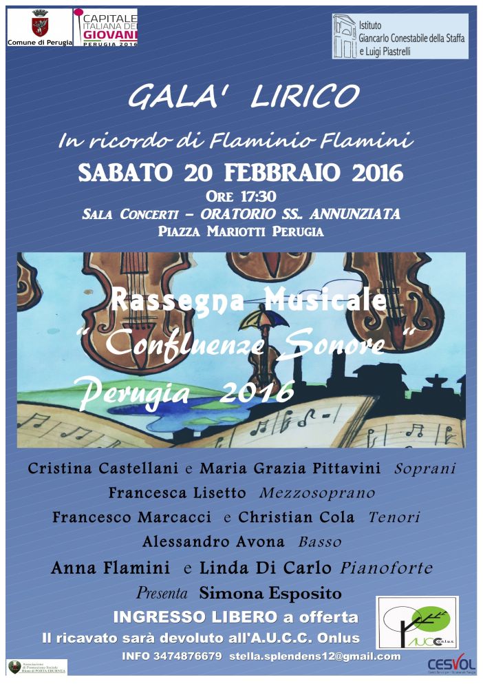 Il concerto rientra nella programmazione della rassegna musicale Confluenze Sonore ideata da Maria Grazia Pittavini a cui è affidata anche la direzione artistica. Soprano e docente di canto al Conservatorio di musica “F. Morlacchi” di Perugia, Maria Grazia Pittavini è stata amica e insegnante di canto di Flaminio Flamini. Si legge in una sua nota «Flaminio era sempre presente a tutti gli eventi musicali ed era sempre un onore per me averlo ospite a un concerto, perché sapevo che avrebbe ascoltato con grande attenzione e competenza, esprimendo il suo giudizio con obiettività e acume. Pregi – conclude la nota – forse ereditati dallo zio Giuseppe Flamini, grande basso perugino dotato di una voce di rara qualità. Così dedico questo concerto a entrambi: a Flaminio e a Giuseppe con ammirazione e affetto».