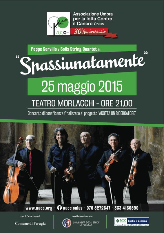 Peppe Servillo e il Solis String Quartet hanno deciso infatti di donare all’AUCC onlus il concerto “Spassiunatamente” che si terrà lunedì 25 maggio al teatro Morlacchi di Perugia alle ore 21. Il ricavato dell’evento sarà dunque interamente devoluto all’associazione.